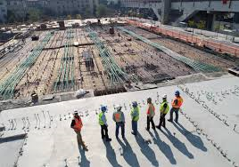 Modern office building construction with energy-efficient systems and contemporary design.